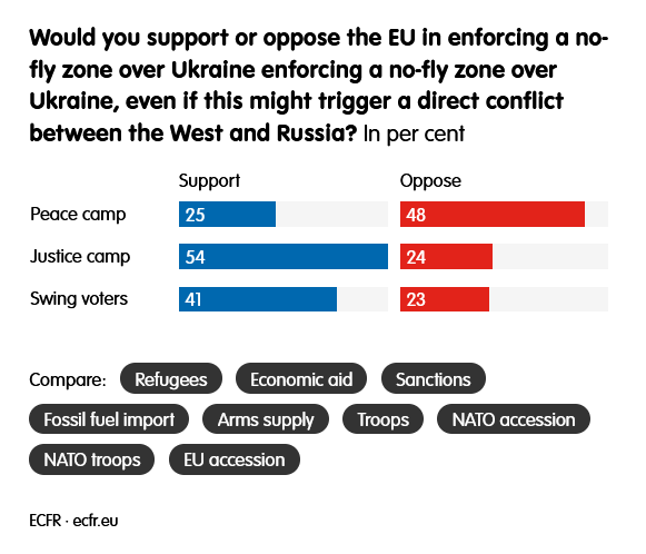 Now some of the most important bits of information, tucked away deep in this survey. Support for escalation in the form of a no-fly zone risking open conflict split along peace/justice lines, though judging from the "swing" camp, it is still uncomfortably close to a majority. /6