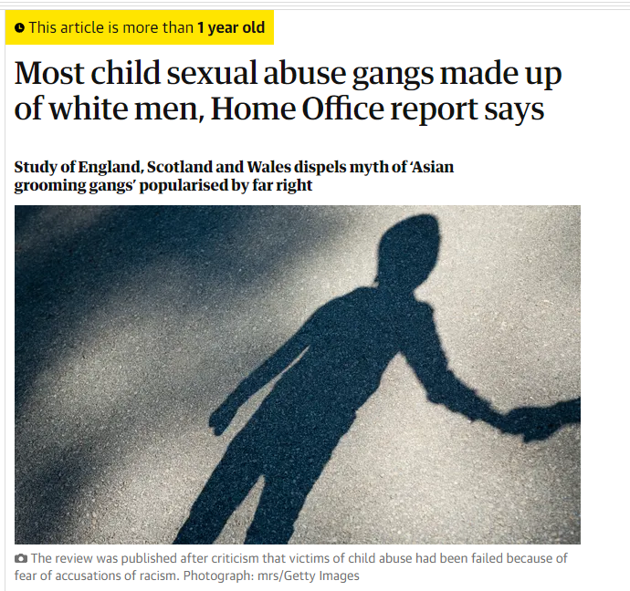 @guardian Why would the @guardian write headlines which demonise White men despite the evidence showing they are hugely underrepresented? Furthermore, call Asian grooming gangs a myth, when the report shows they are massively overrepresented?