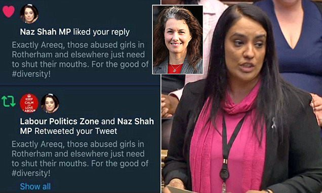 @guardian @ukhomeoffice Labour MP for Bradford Naz Shah, who is of Pakistani heritage herself, retweeted that ‘those abused girls in Rotherham and elsewhere just need to shut their mouths. For the good of #diversity’. She claimed she did it by mistake, despite both liking and retweeting it. Image