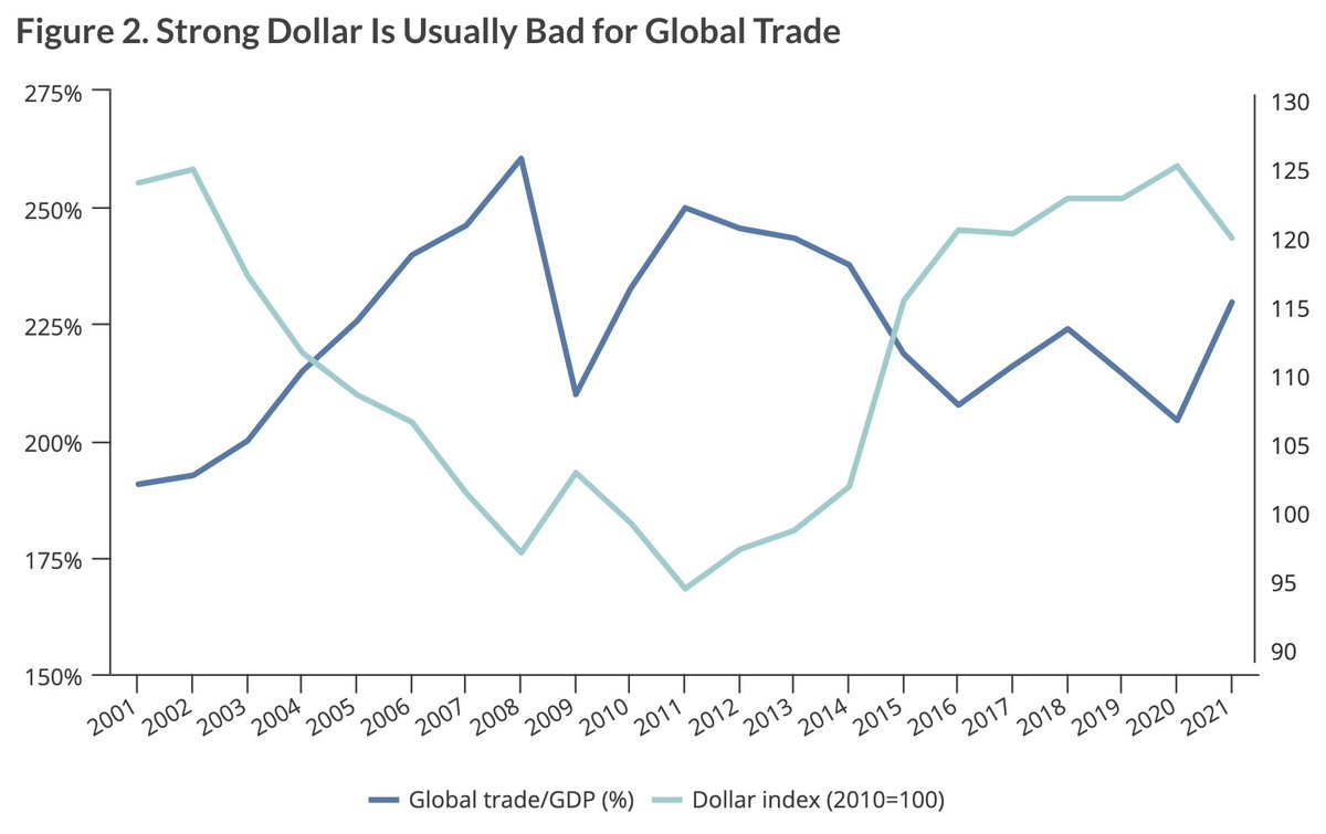 4/Third, exports likely won’t save the day again. The US dollar has appreciated by 5% this year because of the Fed’s tightening. Historically, this spells bad news for global #trade and Chinese goods.
