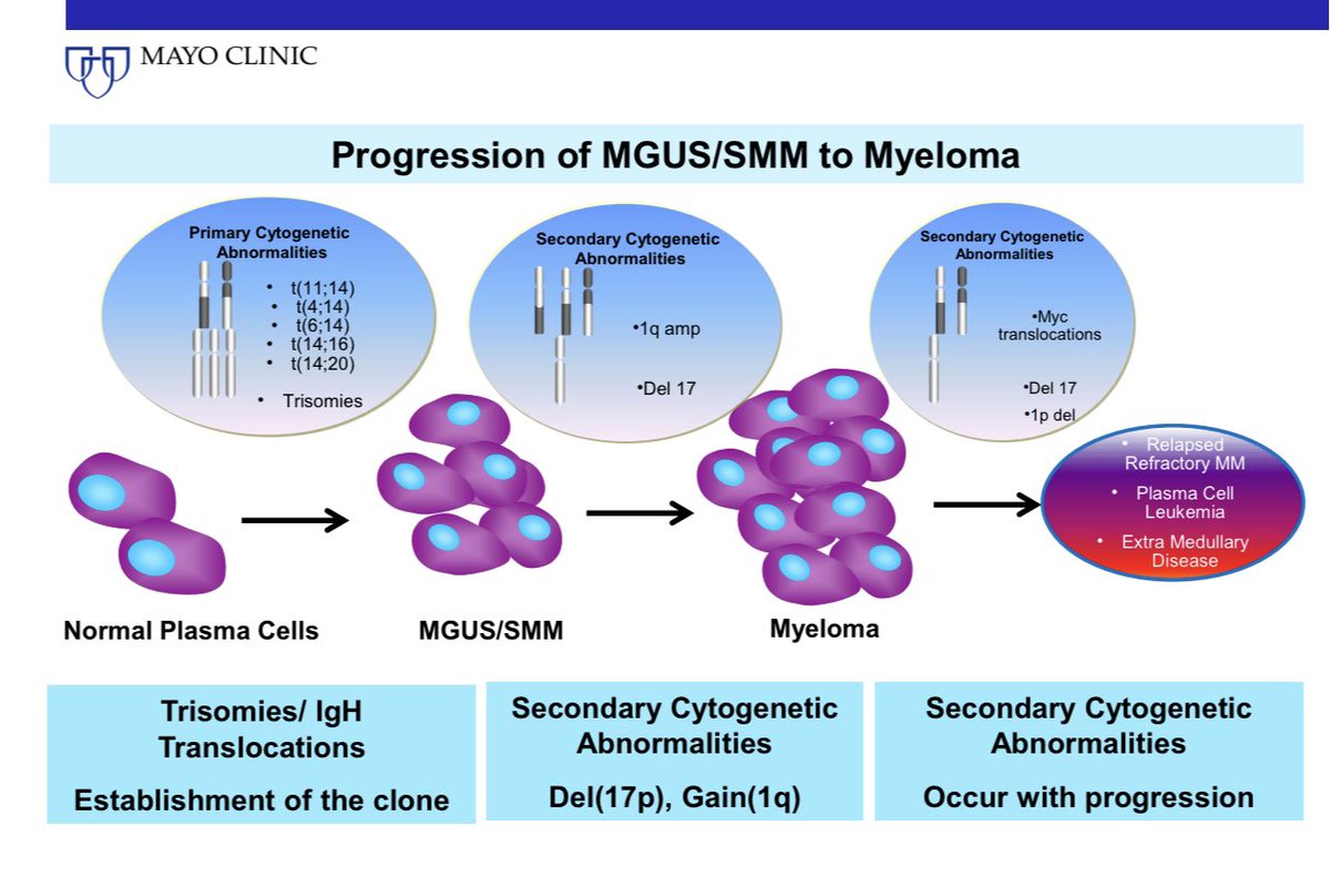 1) Normal plasma cell becomes MGUS clone. Triggered most likely by infection/inflammation leading to either trisomies or chromosome 14 translocations.