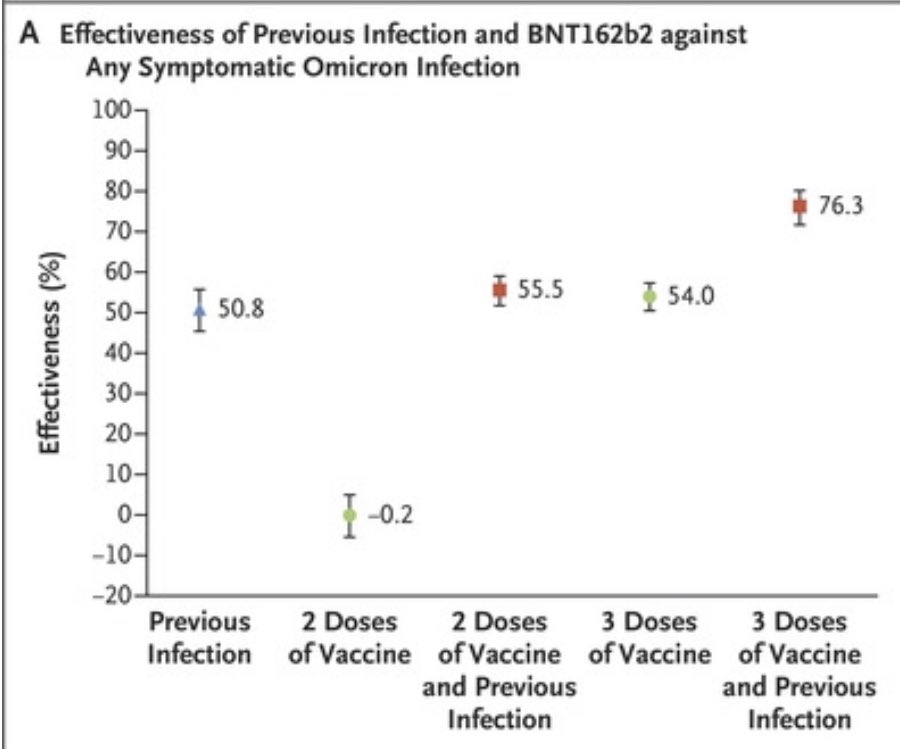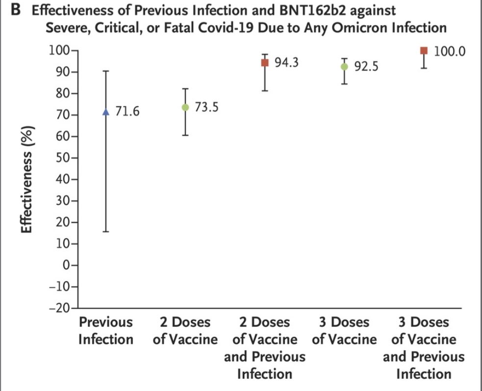2/ Importantly, vaccines alone, prior COVID alone, and prior COVID plus vaccine (hybrid immunity) all had >70% efficacy against severe infection and in preventing deaths from omicron.