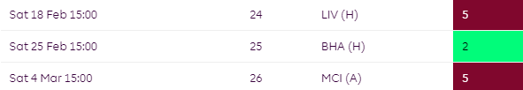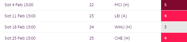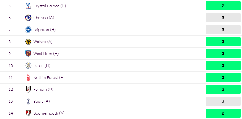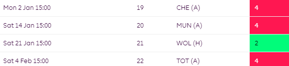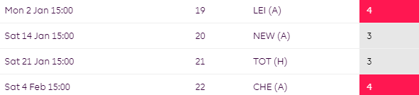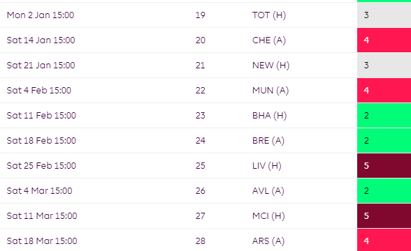 Things aren’t much better later on in the season where they face Liverpool and City between GW24-GW26.