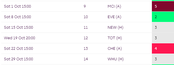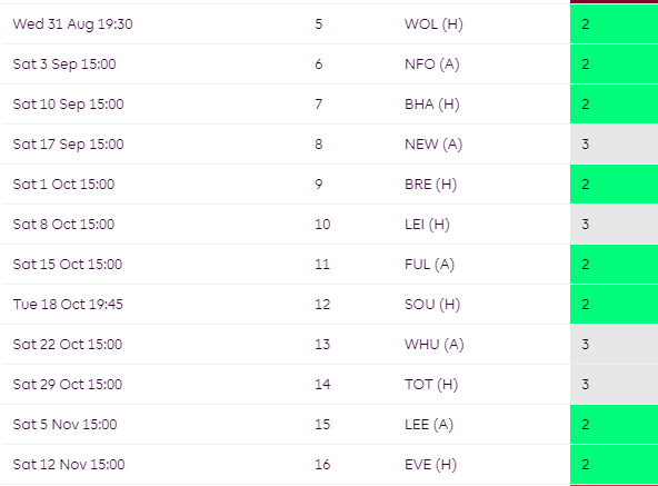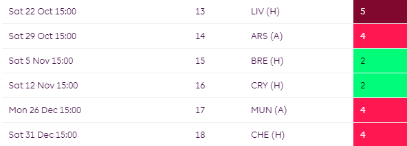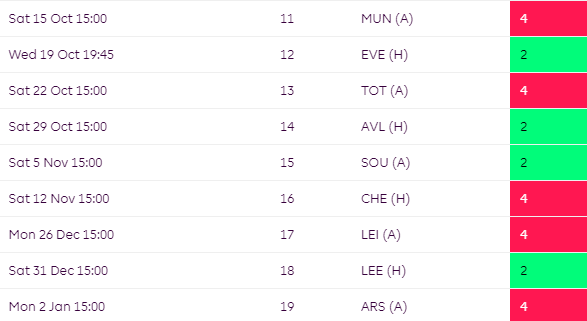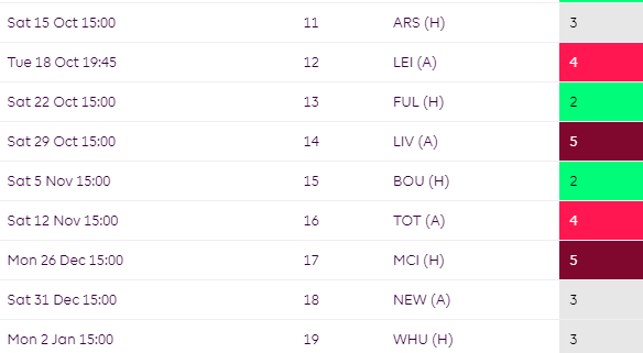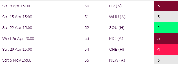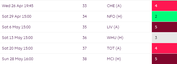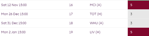 Some mixed fixtures for Brighton over the campaign but their worst run comes towards the end of the season where they face TOT, CHE and MCI all in a row.