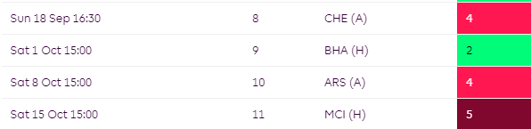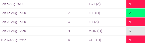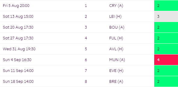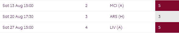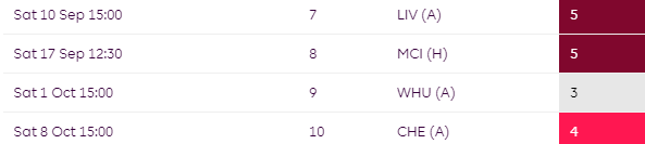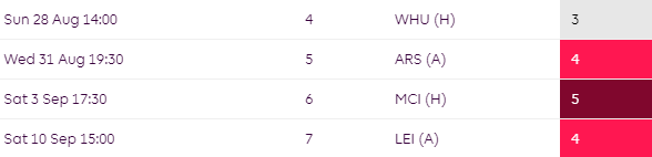 You may want to think twice about starting with Villa players for their opening 3 as things take a turn from GW4 where they face WHU, ARS, MCI & LEI over the next four.