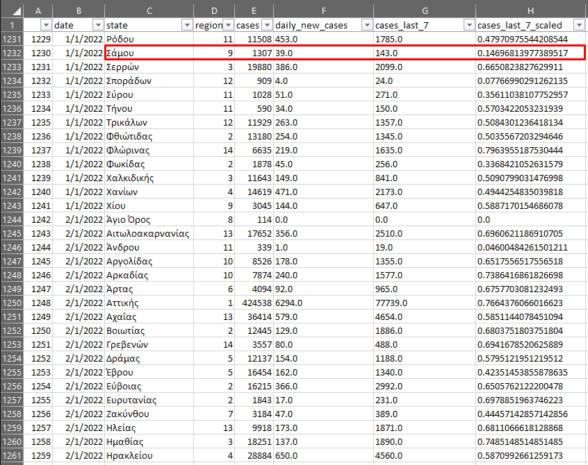 των κρουσμάτων των τελευταίων 7ημ. και το διαιρούμε με την μέγιστη τιμή της περιοχής μέσα στον χρόνο. πχ στις 1/1/22 η Σάμος είχε σύνολο κρουσμάτων 7ημέρ. 143, με μέγιστη τιμή μέσα στο έτος το 973, άρα 143/973 = 0.1469...) αποθηκεύουμε τις τιμές, και από κει και πέρα βρίσκουμε