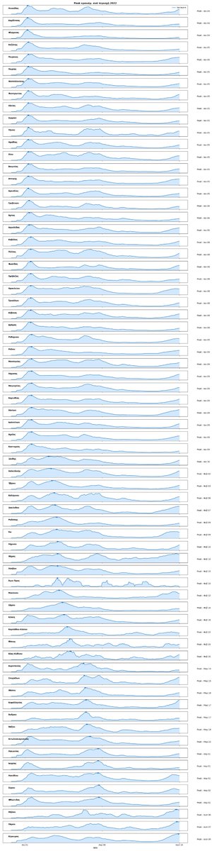 Όπως βλέπουμε το κύμα ξεκινάει στα νησιά (16 στο σύνολο). Αξίζει να σημειωθεί πως οι φωτιές στην Εύβοια ξεκίνησαν στις 3/8 και η περιοχή είχε Peak κρουσμάτων 23/8.