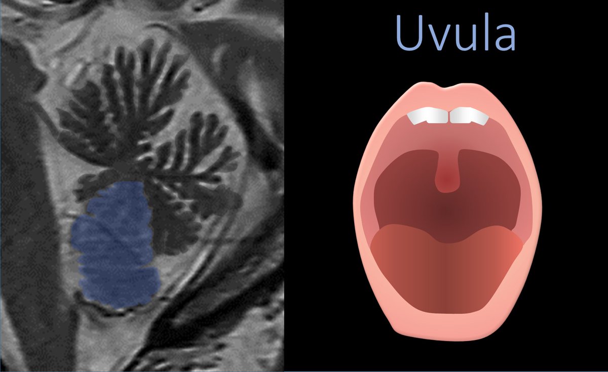 9/Hanging down from the bottom of the vermis is the uvula. It is easy to remember how they named this one. It hangs down from the vermis just like your uvula hangs down from the roof of your mouth.