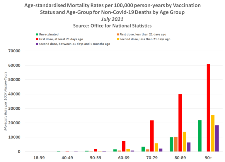 Para não oferecer engajamento, não citarei a reportagem. O gráfico em questão que está sendo distorcido para desinformar é um dado importante da @ONS que mostra as taxas de mortalidade por 100 mil pessoas-ano, de acordo com alguns parâmetros, como a vacinação, em Jul/21