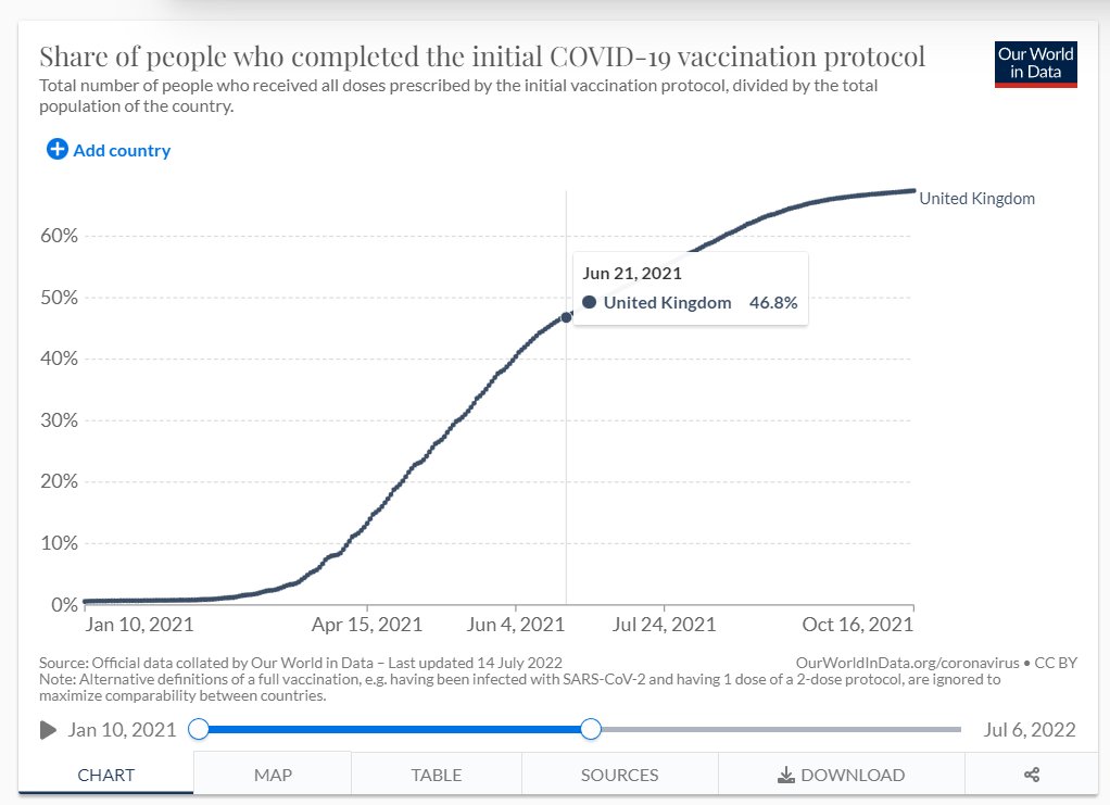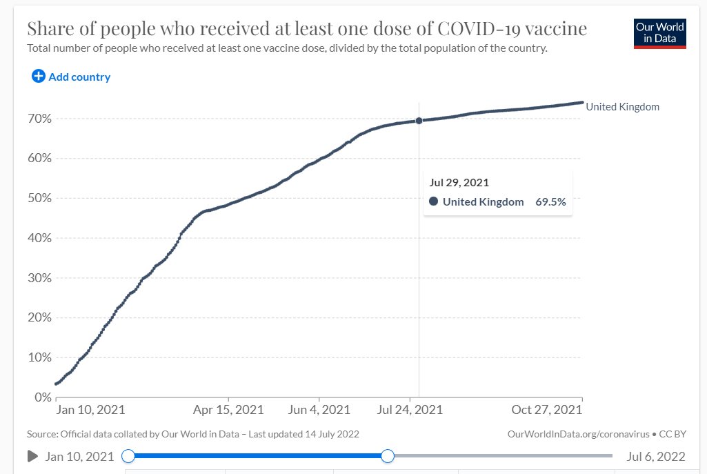 Em Jul/21, tinhamos cerca de 50% da população de UK vacinada com o esquema completo das vacinas contra a COVID-19 e quase 70% da população vacinada com pelo menos uma dose. Ou seja, pegando a população como um todo, sem diferenciar pela idade, já tinha muita gente vacinada.