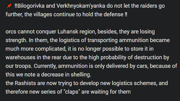 The orcs can not conquer the Luhansk region and they are loosing strength. They have also tried to adapt to the HIMARS situation by using "on demand" delivery with cars(trucks?) for ammunition instead of building storages. t.me/serhiy_hayday/… @serhey_hayday