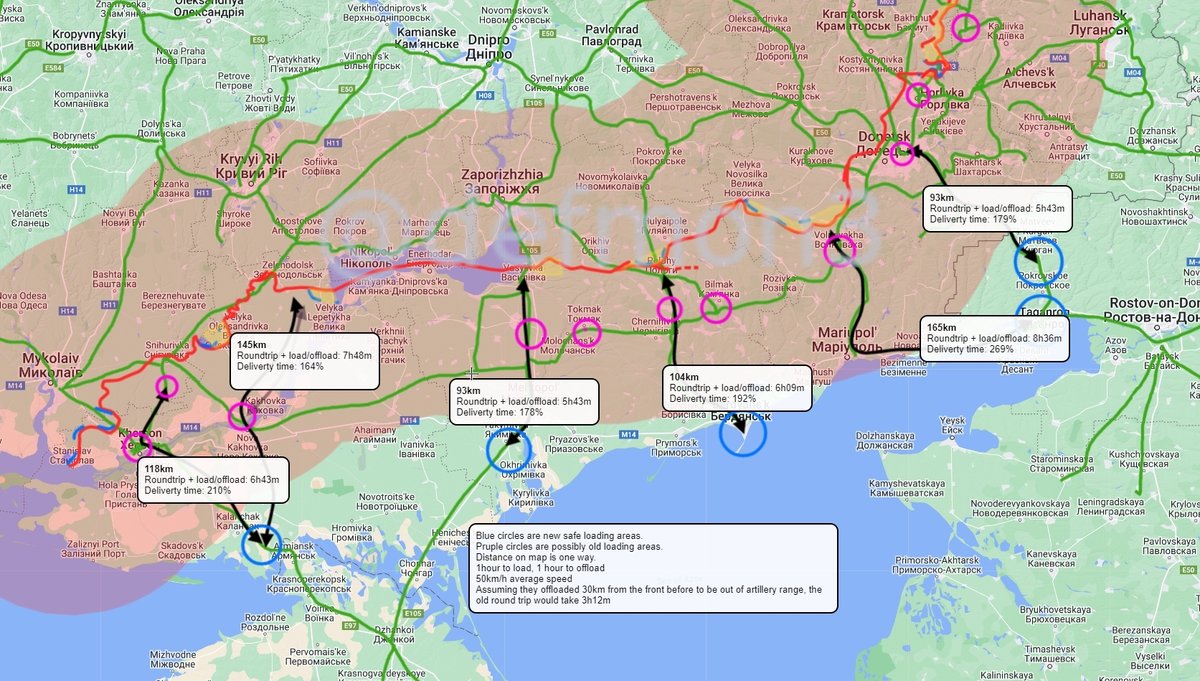 RU forces are moving the train offload points out of HIMARS range, this image gives an indication of how this affects delivery times.