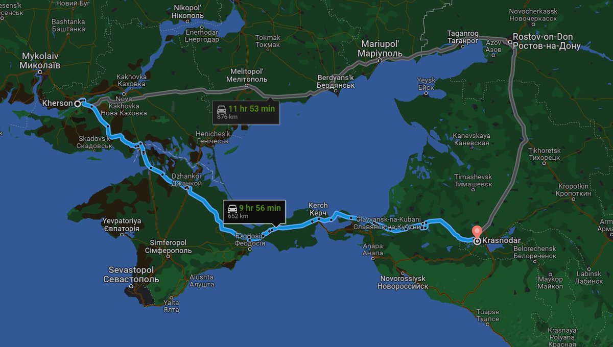 Krasnodar-Kherson is a 650km drive for a total of 1300km. At an average of 50km/h this round trip would take 26 hours to drive nonstop. So that solution is out of the question. The only option is to operate within range of the HIMARS.