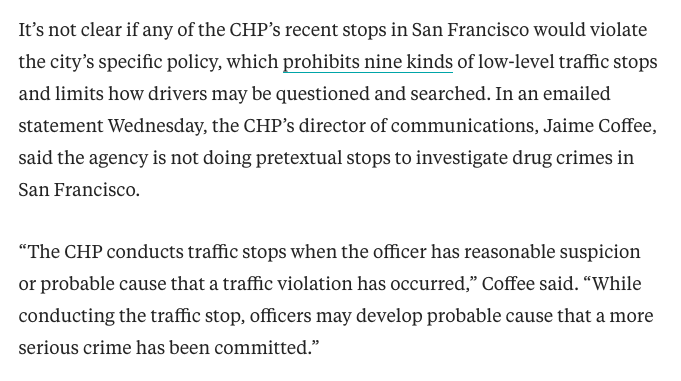 CHP is in on the grift. They've been conducting traffic stops for things like broken taillights as a pretext for looking for drugs. They deny that's what they are doing, but not credibly—they were brought into the city for the *explicit purpose* of targeting drug use/sales.