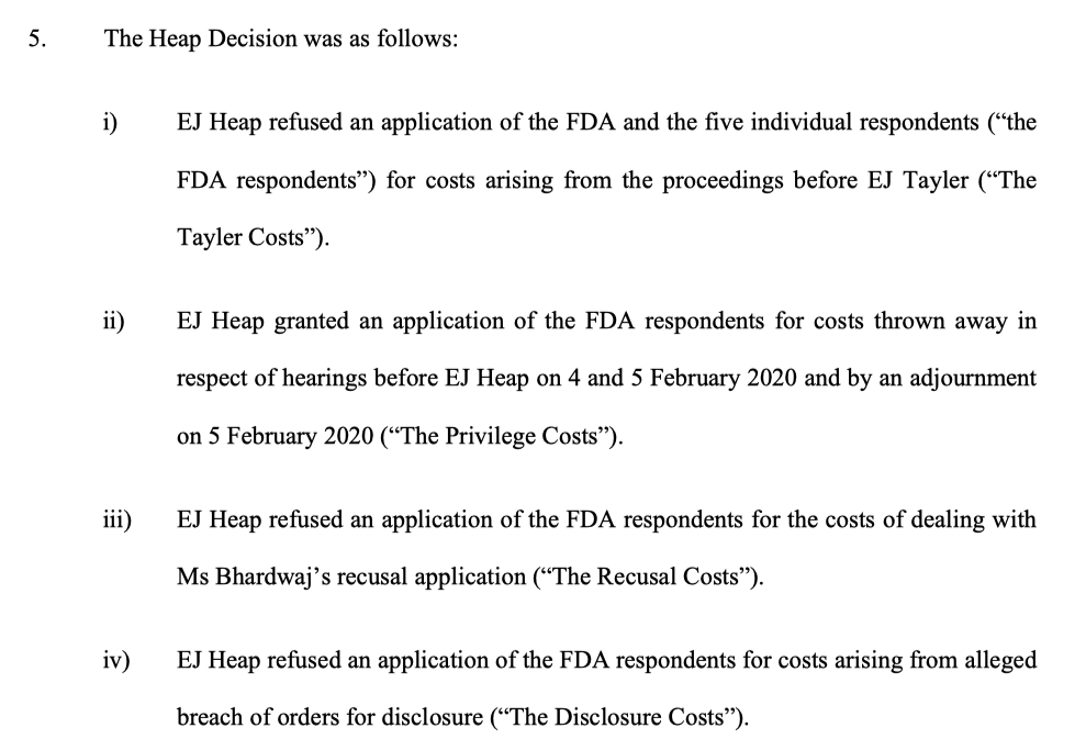 4/ The costs orders made (by EJ Heap) were limited to costs thrown away for 2 days' hearings/adjournment on a privilege issue. EJ Heap declined to make costs orders to FDA re more substantial applications in re the main ET proceedings & re B's recusal & disclosure applications.