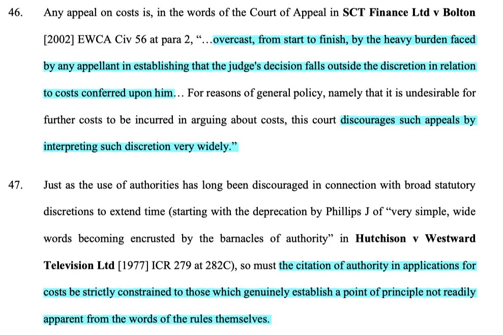 6/ First, the difficulty in appealing a costs application, discouragement by the appellate courts from doing so, & the need to separate out helpful costs authorities explaining points of principle as against those reaching outcomes on particular facts.