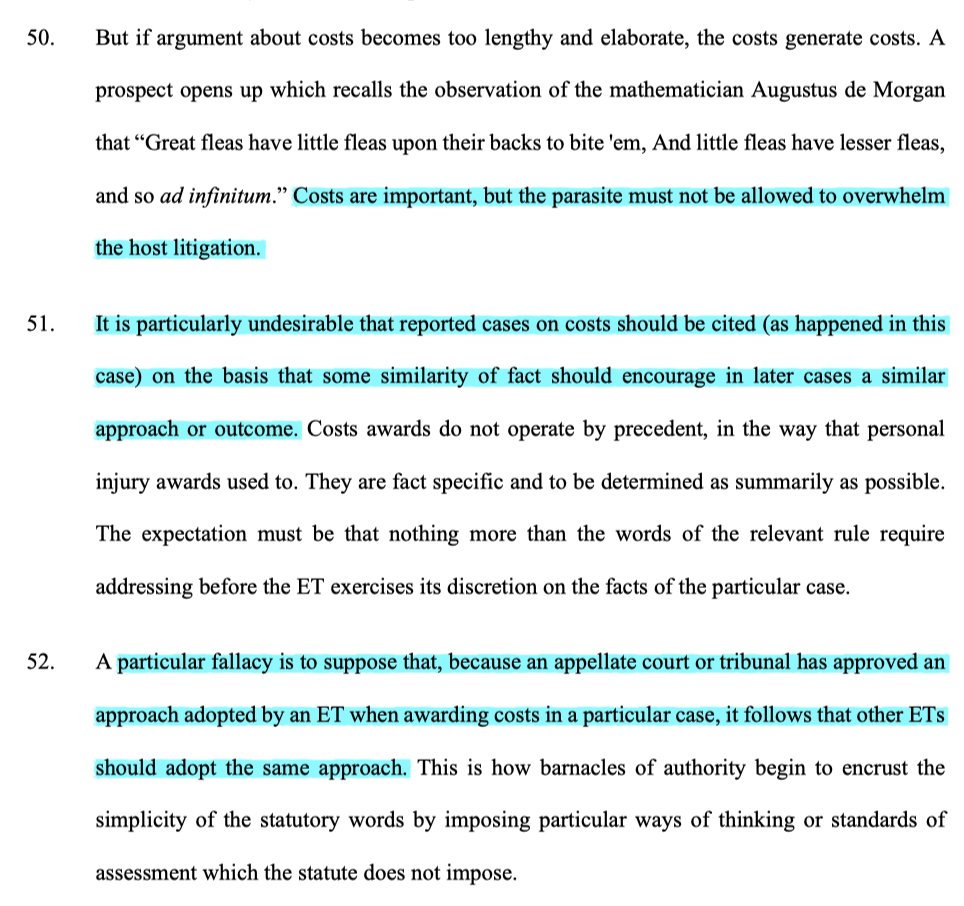 9/ In this case, as privilege had been waived the EJ had all legal advice, which advised B of good prospects of success. It was acceptable for the EJ to take that favourably advice (from experienced employment lawyers) into account in deciding not to award costs.