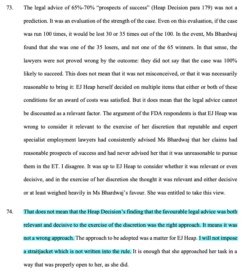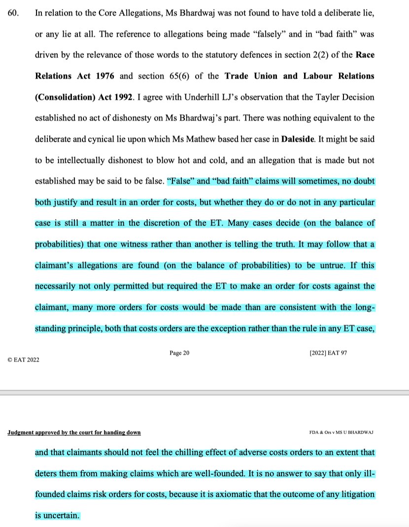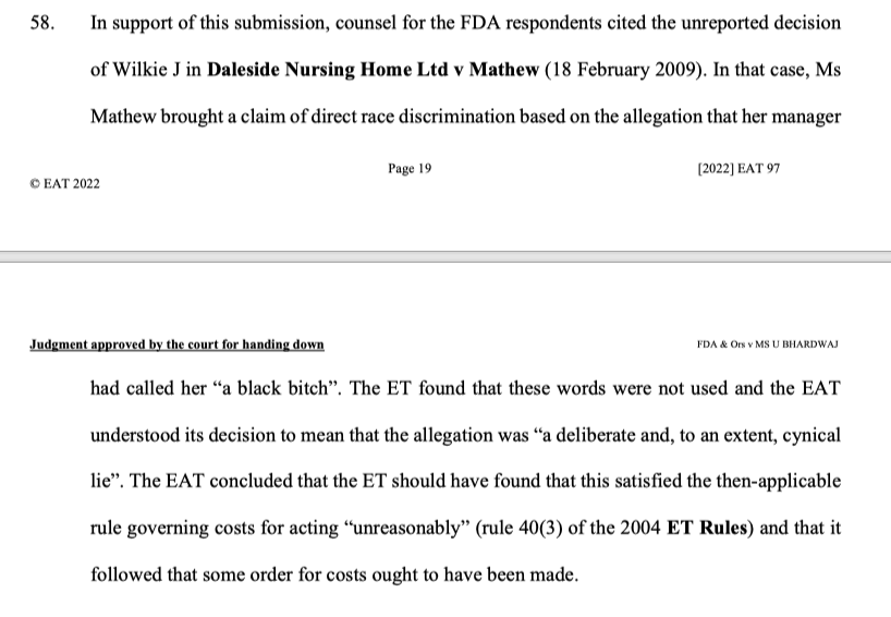 7/ On costs for being found to have lied, the FDA relied on Daleside Nursing v Mathew where the EAT found the ET should've made a costs order for a cynical lie at the centre of a race discrim case.