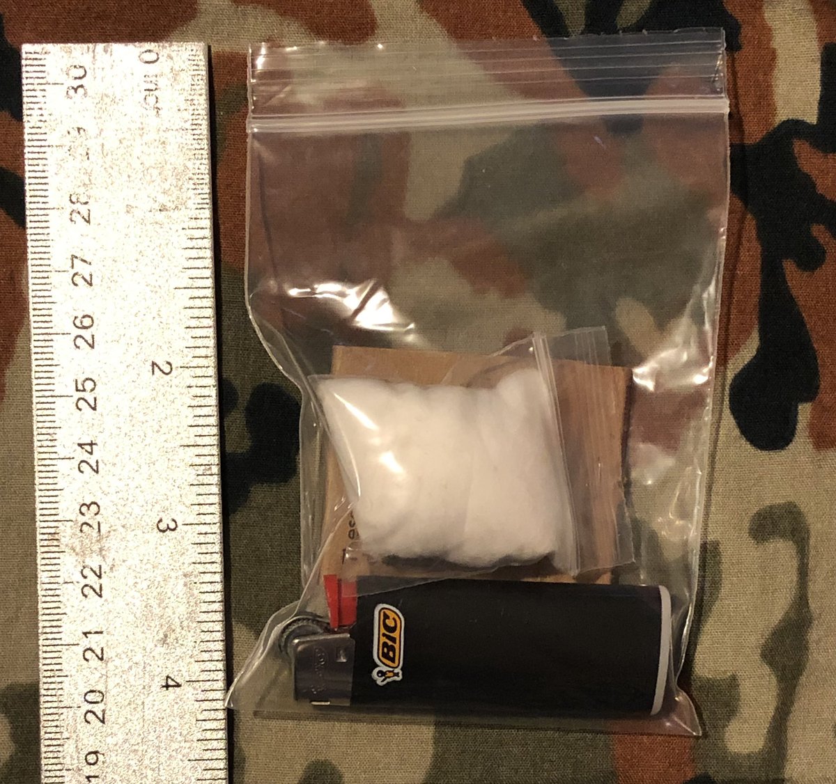 •tiny craft bag w/ enough Vaseline impregnated cotton to pinch off a peanut size, light it & build minimum 3-4 fires.