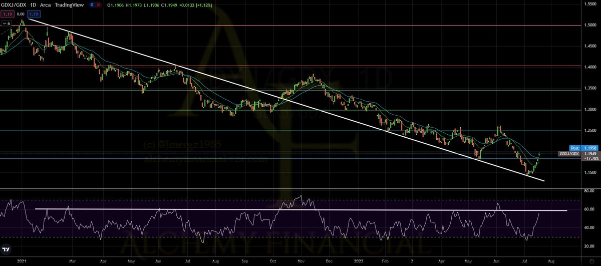 Jrs have underperformed majors for 18 mos & RSI on the GDXJ/GDX ratio has failed at 60 every time w/ 2 exceptions, for 1 month Oct-Nov 2021 & 1 wk June 2022.