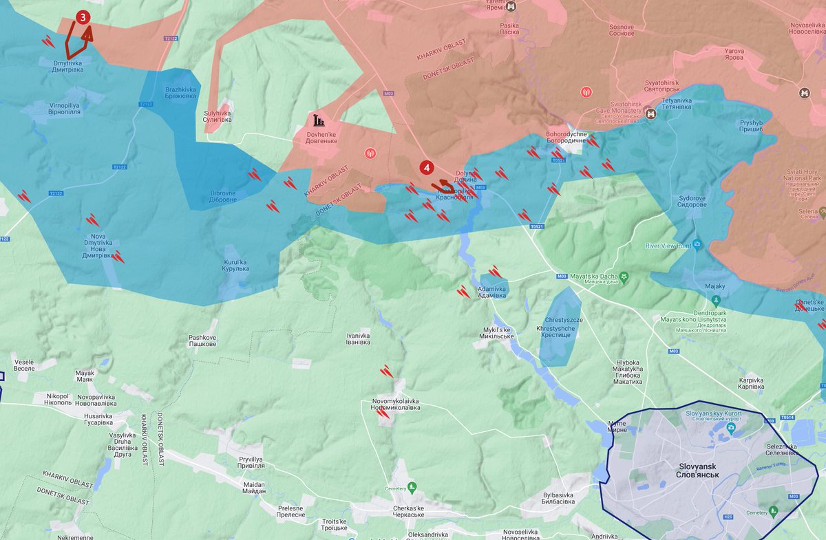 The Barvinkove/Slovyansk area: Ukraine repelled an attack towards Dmytrivka (2), but it is unclear which angle the attack came from. It could have from from the north, as depicted, or possibly from the east.
