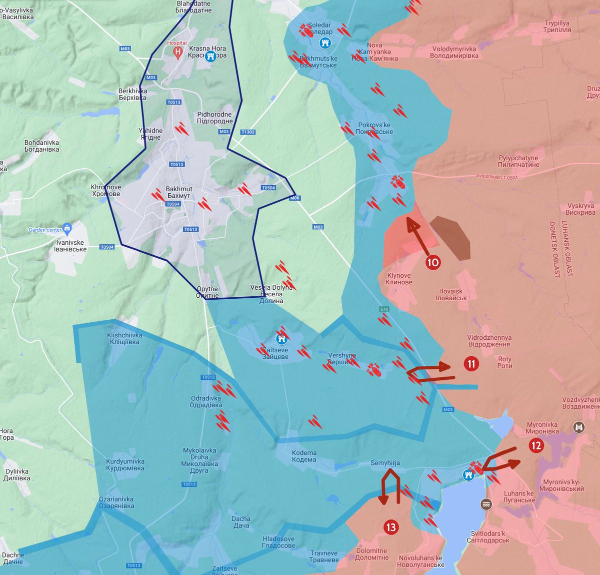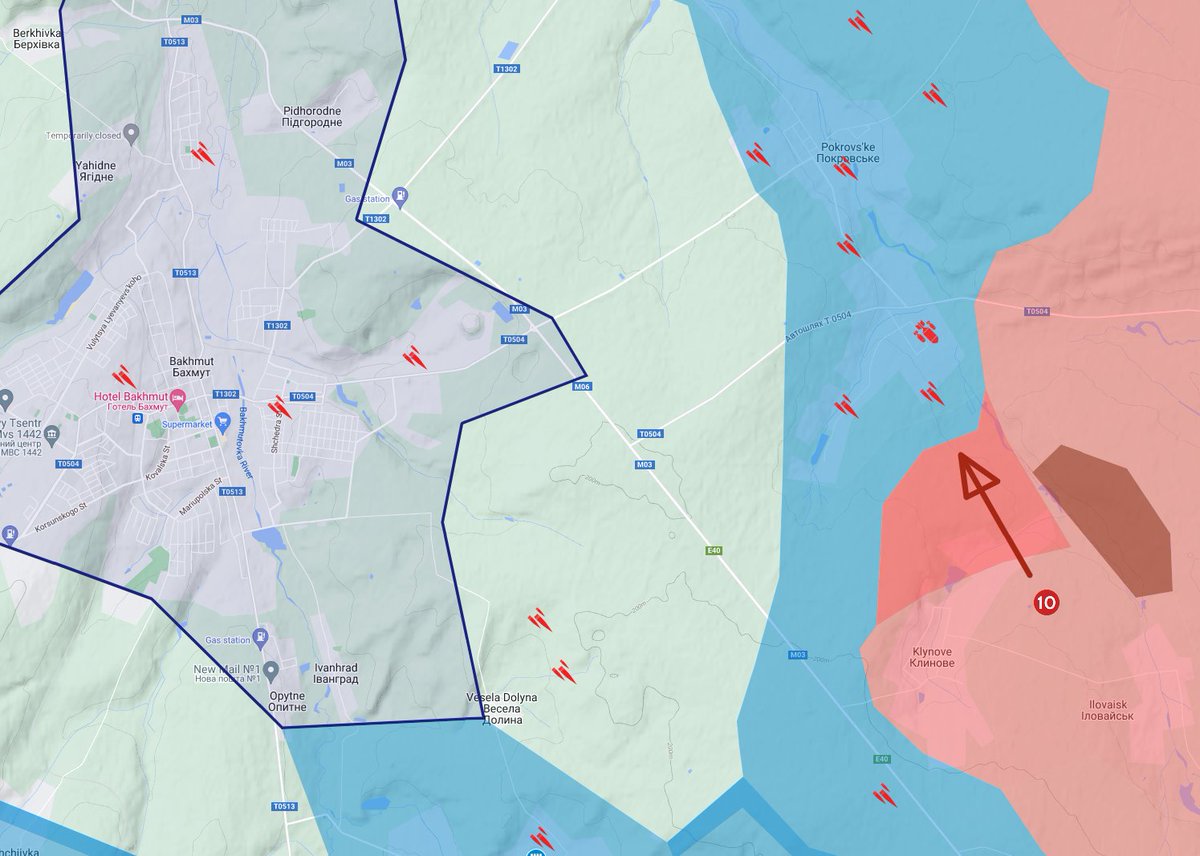 The Bakhmut area: One of the more interesting, albeit ultimately irrelevant developments of the day: The Wagner group attacked north towards Pokrovske from Klynove (10). They are establishing themselves on the southern outskirts of Pokrovske.