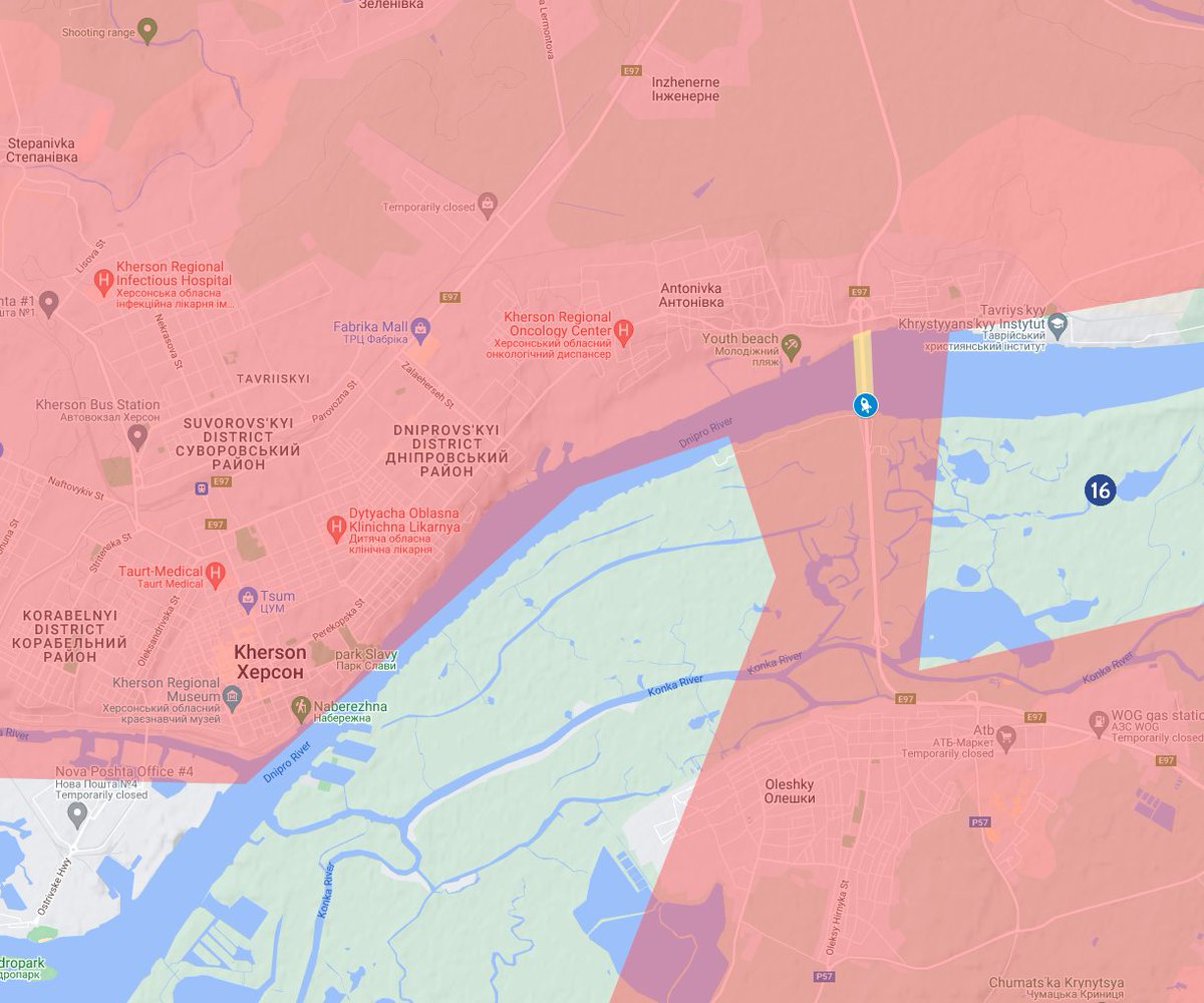 If one bridge is gone, when the second gets threatened Russia risks having all of their forces in the city totally cut off. You can cross those red bridges, but they are vulnerable to Ukrainian attack. ESPECIALLY if Ukraine captures Snihurivka.