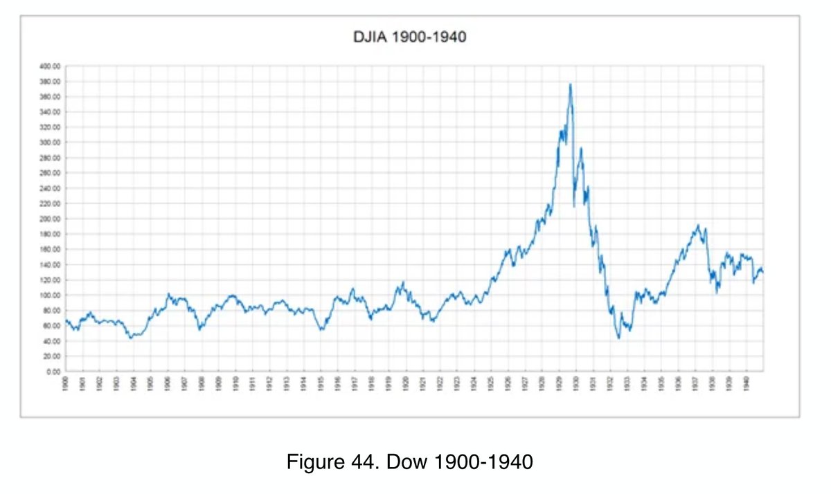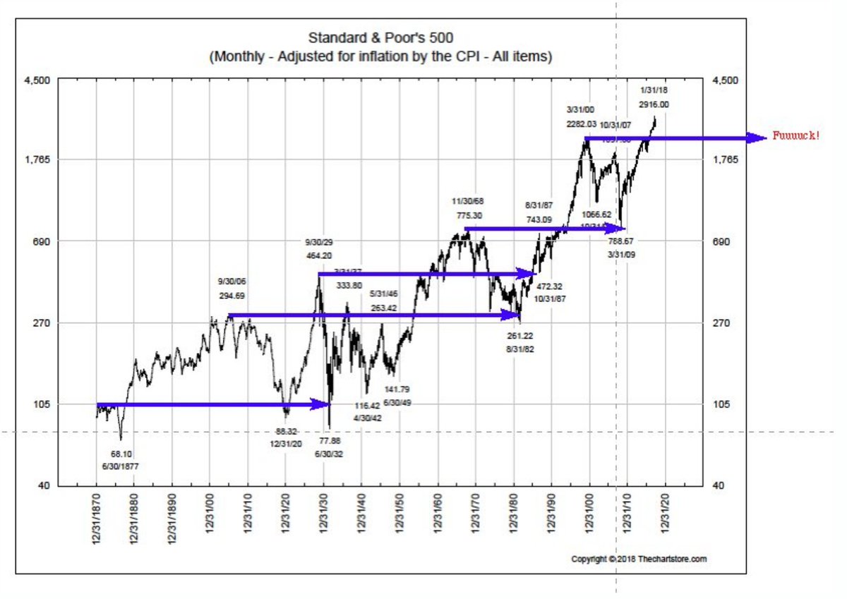 And one of my favorites (made using ChemDraw). Those arrows represent the time that the inflation-adjusted market wobbled around but went precisely nowhere. They are 45-75 years long...