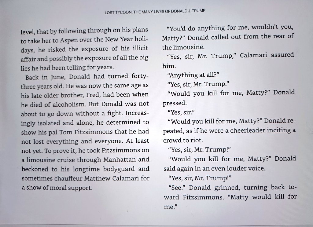 There are many horrific anecdotes in "Lost Tycoon" involving Trump urging someone to commit violence on his behalf. Here is one where he goads future Trump Org COO Matthew Calamari -- then his bodyguard-- to kill for him: