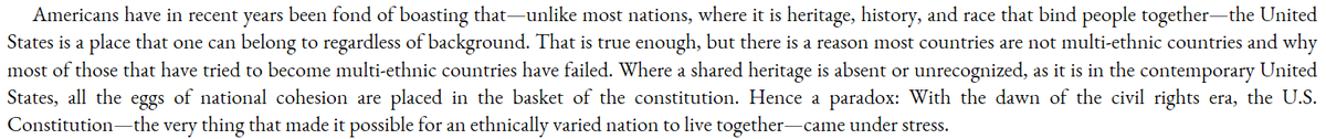 The mid-century US, being highly multiethnic, was not strongly bound by heritage of culture. The national cohesion essential for a multiethnic state was highly dependent on the Constitution, which was then undermined by Civil Rights.