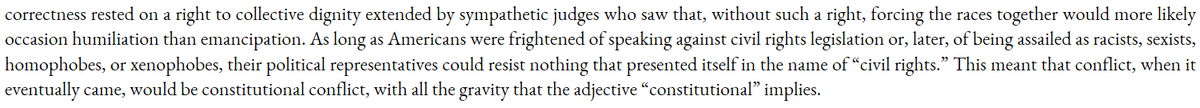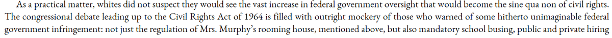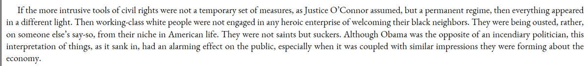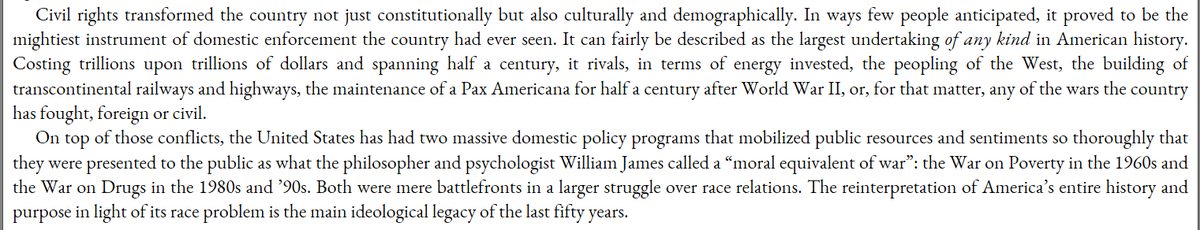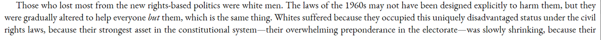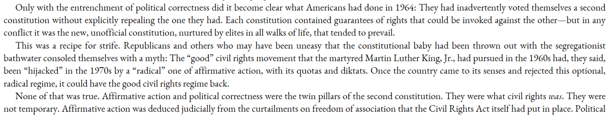 Just read Christopher Caldwell's "Age of Entitlement." It's a good book; the general thesis (that Civil Rights replaced the Constitution) is familiar to the internet right (albeit still foreign to the mainstream) but he substantiates it well and at book length. Some excerpts: