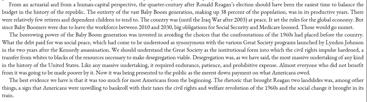 Reagan allowed the losers of Civil Rights (mostly middle class whites, especially men) to avoid paying for it via borrowing from the future, thus sapping any backlash.