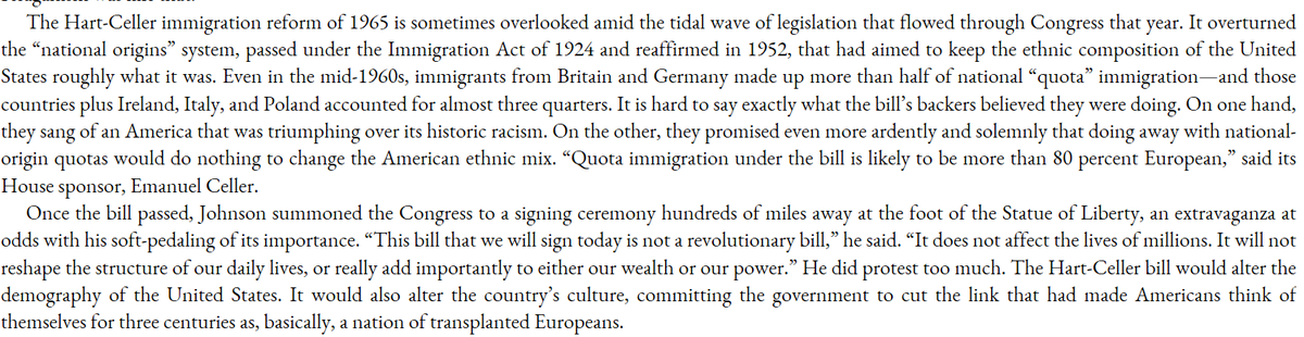 Hart-Celler was passed under false pretenses. Supporters claimed it would have no effect, that iwas basically meaningless virtue signaling. In reality, it was more transformative then even its worst opponents predicted.