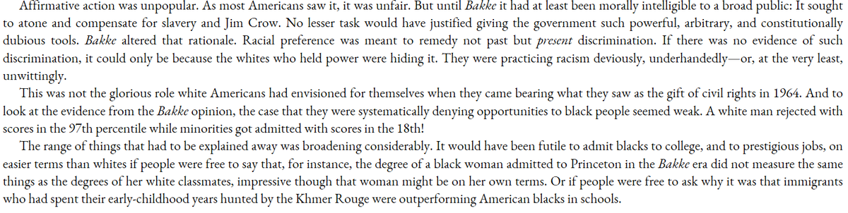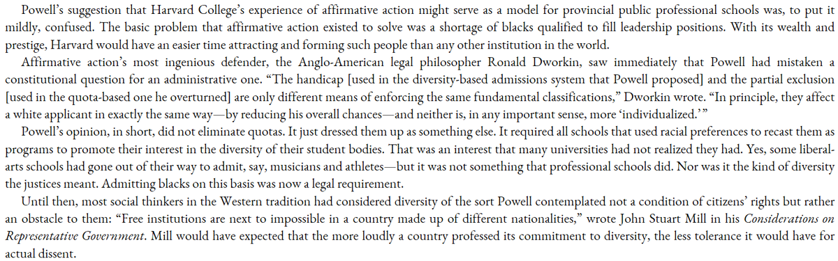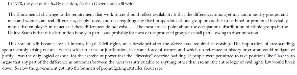 "Wokeness if just Civil Rights Law": the whole obsession w/ diversity came entirely from a 1978 court case (Bakke) which made it the legal rationale for Affirmative Action and thus mandatory.