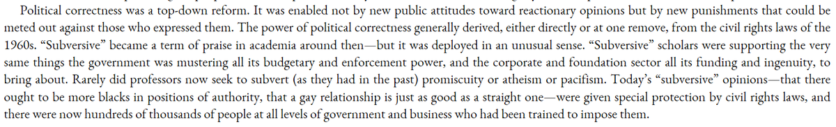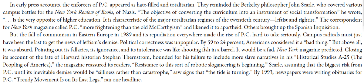 PC was extremely unpopular when it appeared, and so absurd that even attacking it felt unfair. Newspapers were writing its obituary by 1993. But it was never actually dismantled. Shades of all of the "the tide of Wokeness is receding" takes today.