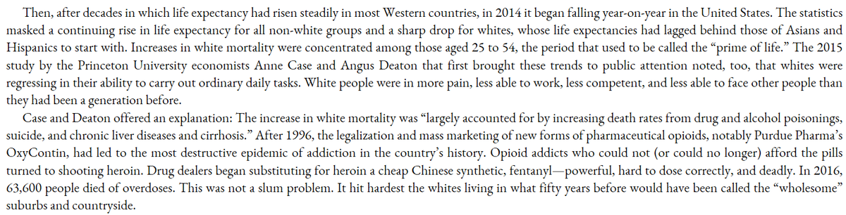 White life expectancy has been falling in the US since 2014 (non-college has been falling for even longer). Not only that, but whites are becoming more in pain, less able to work, less competent, and generally falling apart. Complete social collapse.