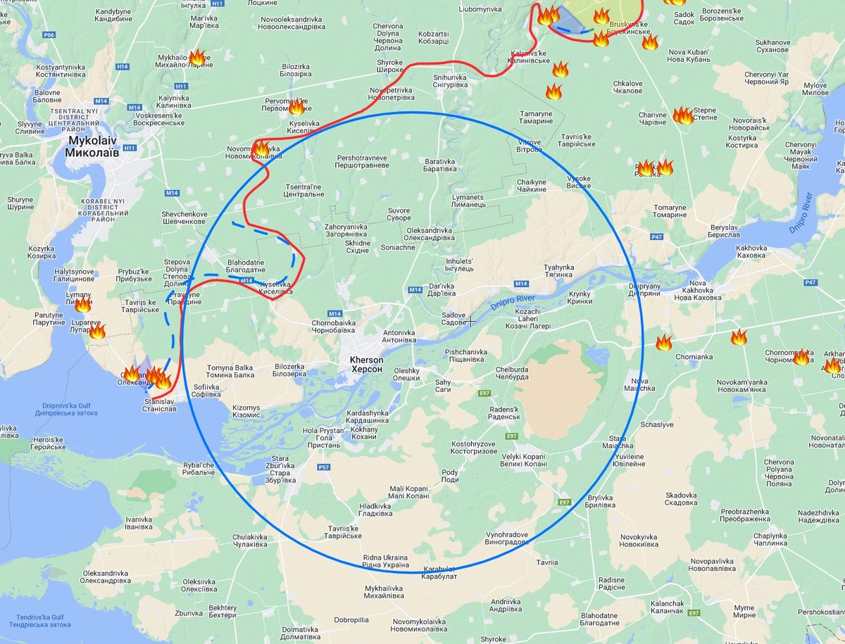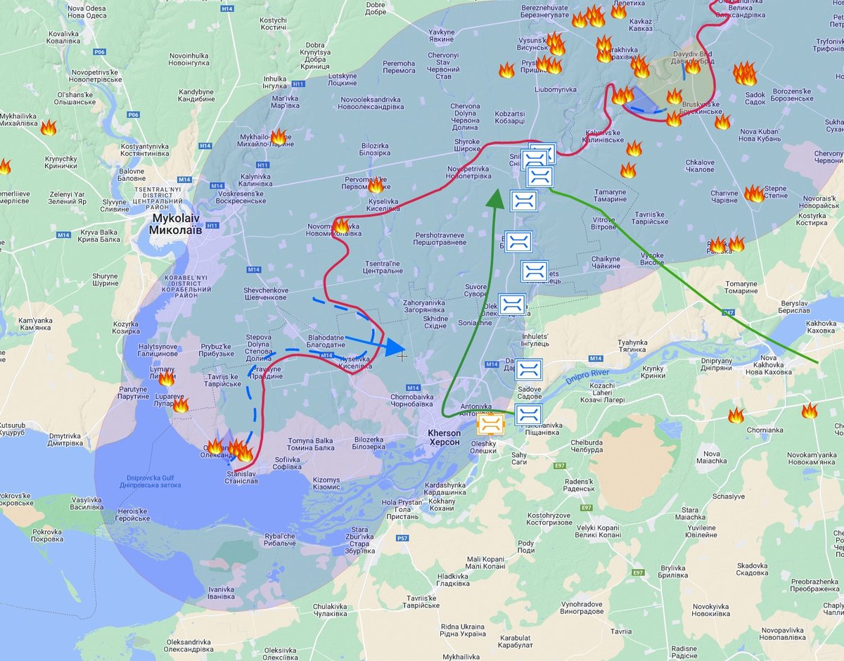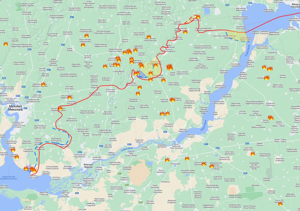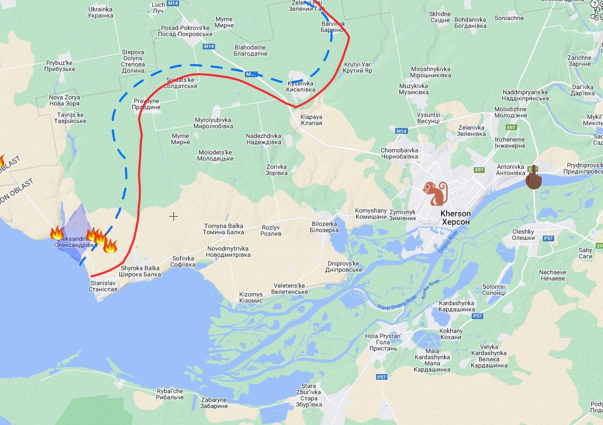 A small push to the east and Ukrainian forces are very close to the railroad and highway supporting the Snihurivka area. There are ofc the access over the Nova Kakhovka dam, but that road is not as good as the one from Kherson->Snihurivka