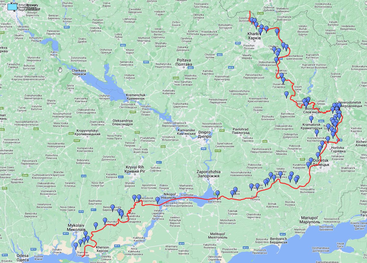 Almost all bridges over the Inhulets river are within artillery range. The blue area is 25km from the front line. Before anyone blows a gasket, this is an indicator, I'm NOT suggesting UA should park M777 at the front line.