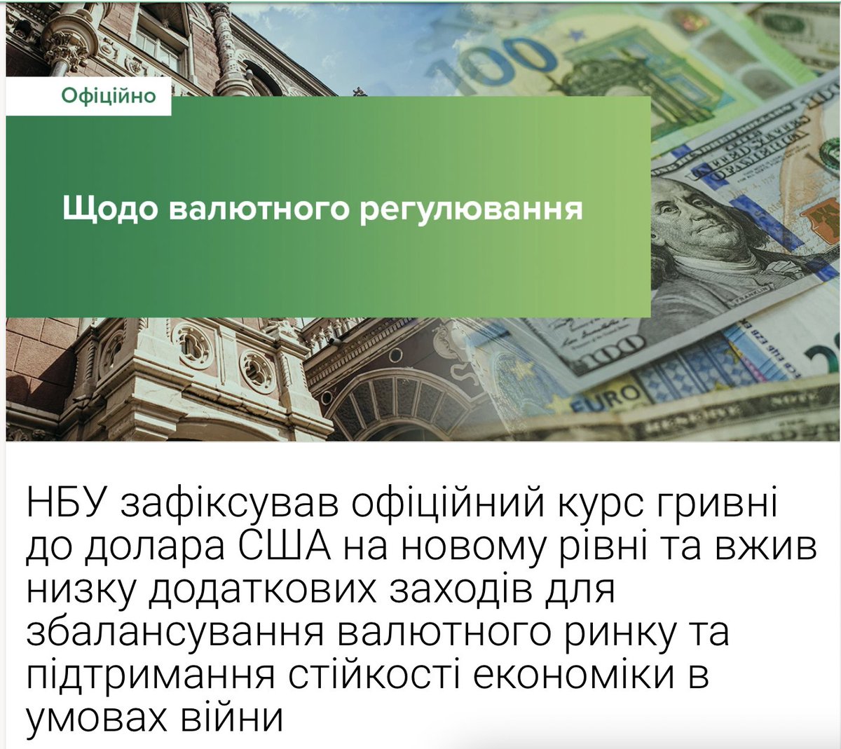 Thus, the National Bank of Ukraine, from July 21, 2022, increased the official exchange rate of the hryvnia to the US dollar by 25% to 36.5686 UAH/dollar