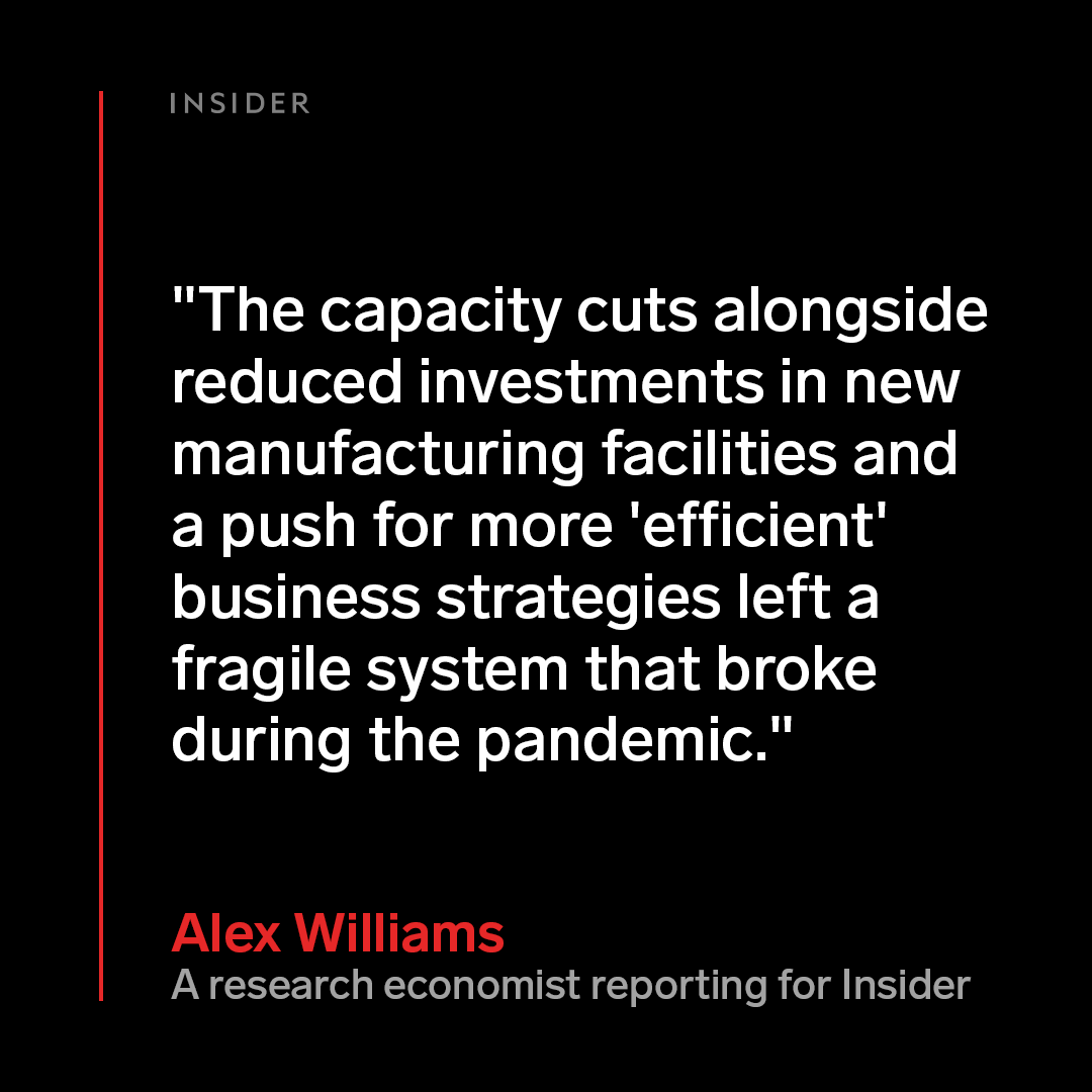 But while these issues are coming to a head now, the physical limitations of our supply chains are the result of decades of cost cutting and downsizing by companies in response to weak demand after the financial crisis.