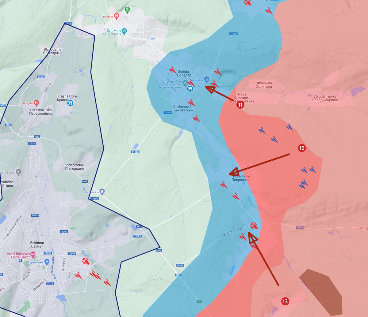 The Bakhmut area: There is ongoing fighting in the outskirts of Soledar (11).