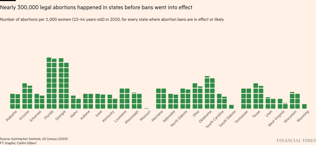 Nearly 30mn women aged 15-44 live in states that have already banned or are likely to ban abortion. Around 290,000 legal abortions occurred in these states in 2020 on.ft.com/3aqopx7