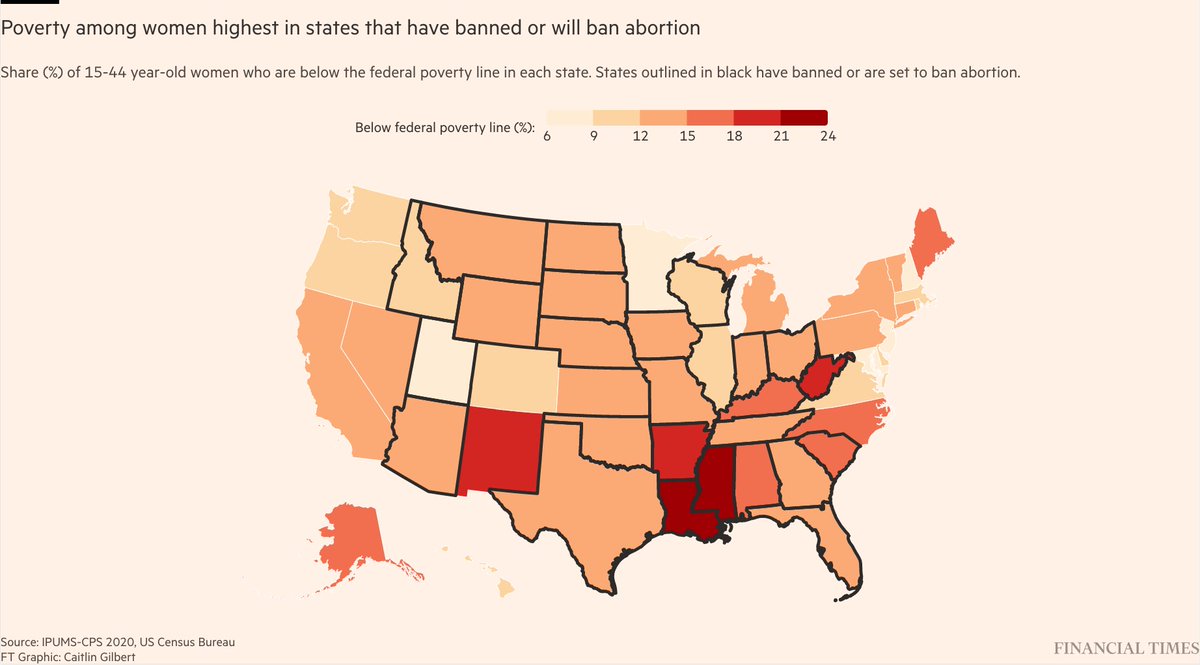 Nearly a quarter of 15- to 44-year-old women in Louisiana and Mississippi, where abortion bans were immediately triggered by the overturning of Roe vs Wade, live below the poverty line on.ft.com/3aqopx7