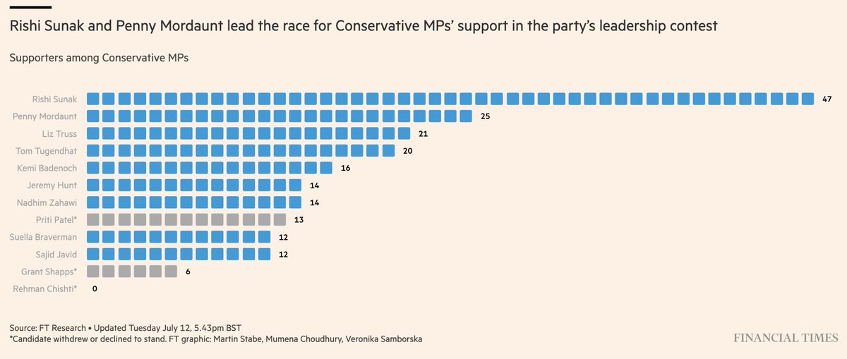 Rishi Sunak currently has the most support from Conservative MPs, with Penny Mourdant in second place. Here is a rundown of which contenders MPs are backing to be the next prime minister 👇 on.ft.com/3IuZXXY