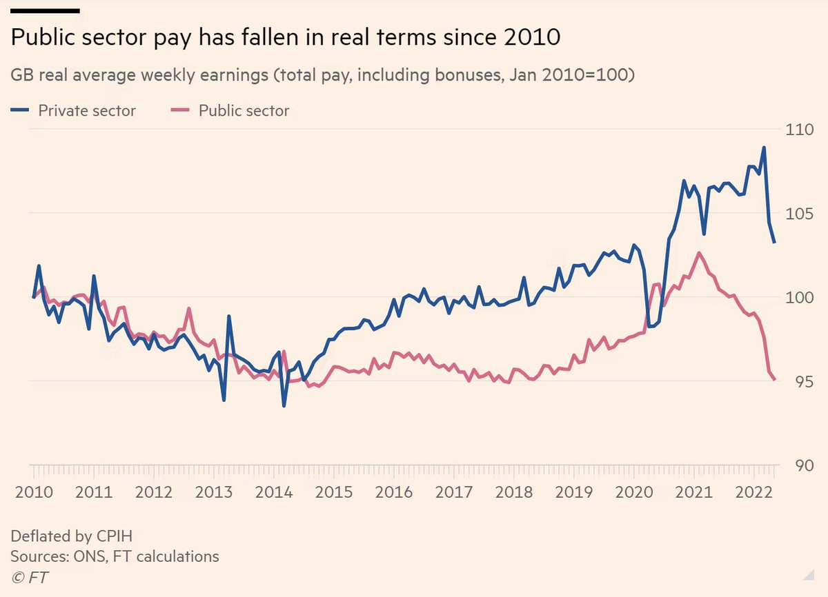 The public sector has fared worse than private business. The average pay of public sector workers is up just 1.5% in the year to May, against total pay growth of 7.2% for the private sector on.ft.com/3Bc9Mbw