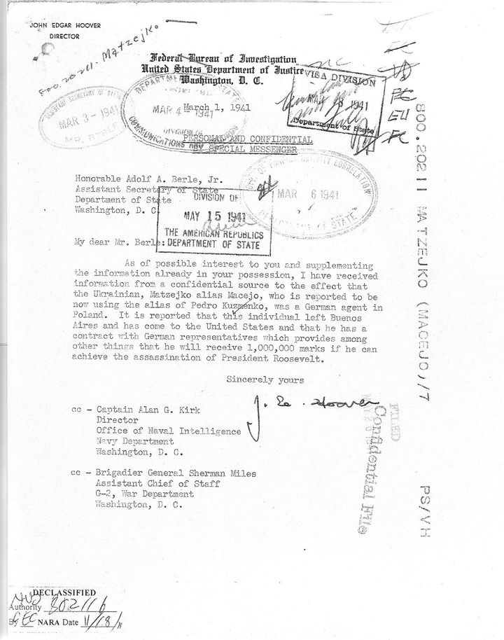 Archival documents that I found in FDR Library & National Archives reveal that FBI & Secret Service investigated reports of Nazi plot to use Bandera OUN terrorist to assassinate President Roosevelt & OUN assistance in assassination of king of Yugoslavia & French foreign minister