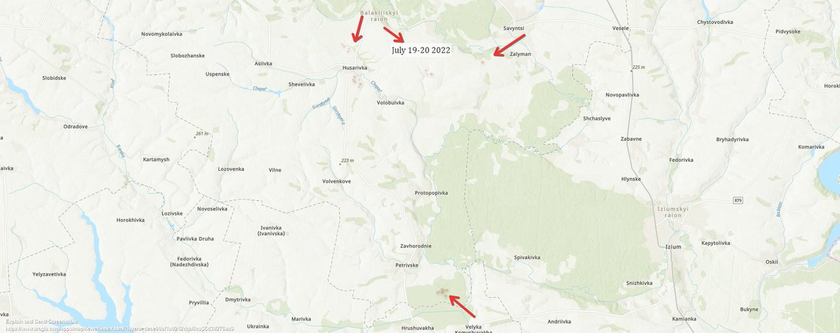 recent events. From July 18 to 19th, RU strikes began preparing the groundwork in the north and south. The next day, we had large strikes against Husarivka (important road junction), towards Chepil, & in the south from Velyka Komyshuvakha NW towards Petrivske.