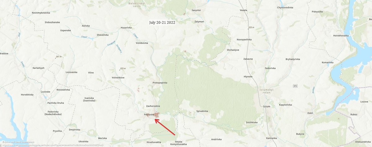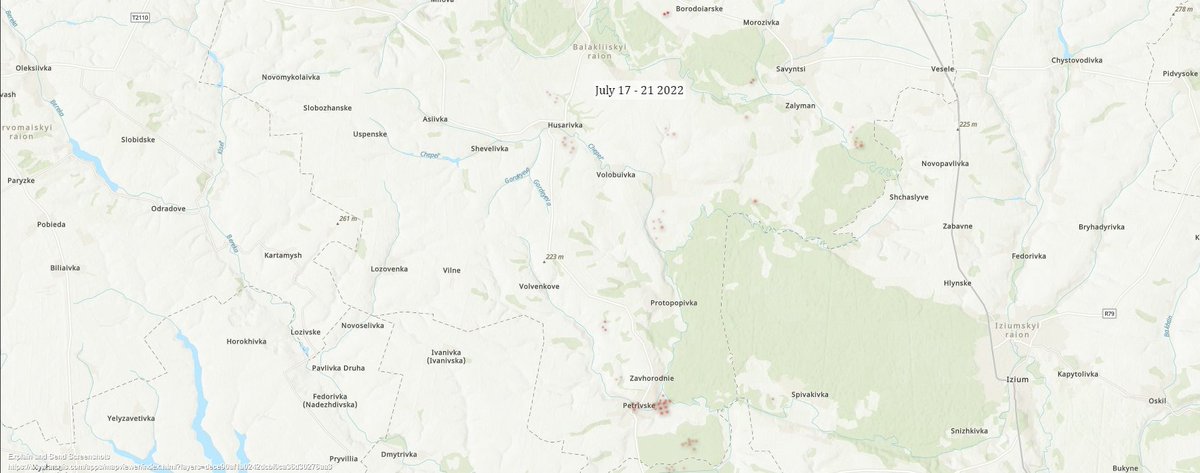July 7th (here we see the lake Geolocated and the forest being hit in red). By then the #Russians had long captured the town as well as neighboring Bilohorivka and the large oil refinery south of the junction. Still as they tried to advance west this small forest patch remained