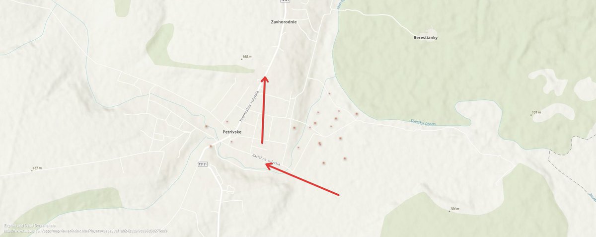 This is an attempt to clear the forest area, cross the small Bereka river & perhaps bypass Hrushuvakha which is strongly defended by UA & is the key road junction in the south. Indeed by the 20-21st, the intense strikes had moved on to Petrivske itself, on low & high ground.