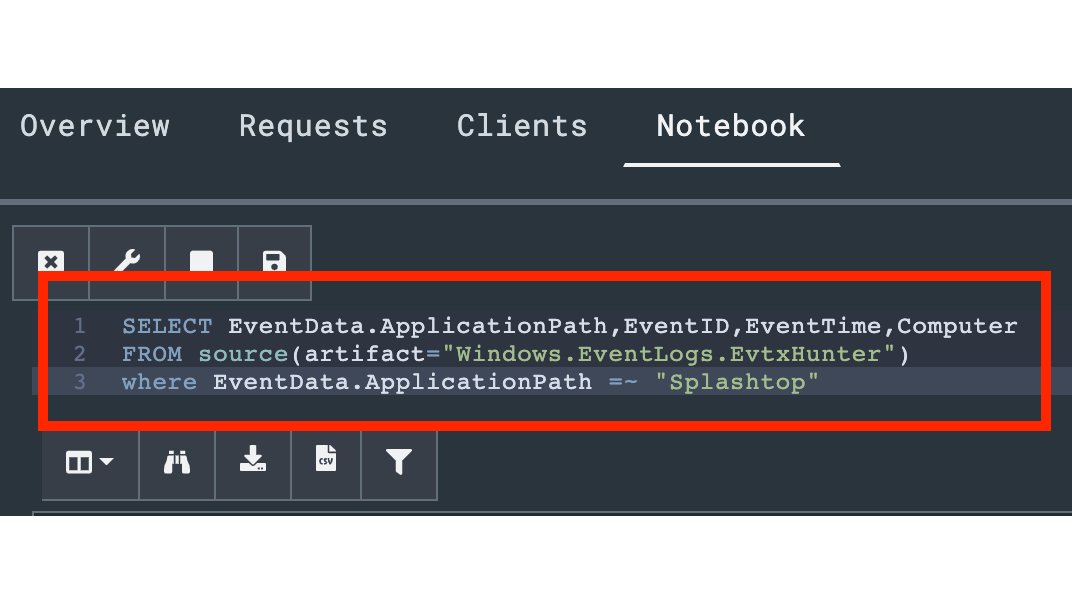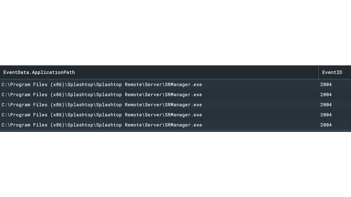 SELECT EventData.ApplicationPath,EventID,EventTime,Computer FROM source(artifact="Windows.EventLogs.EvtxHunter") where EventData.ApplicationPath =~ "Splashtop"